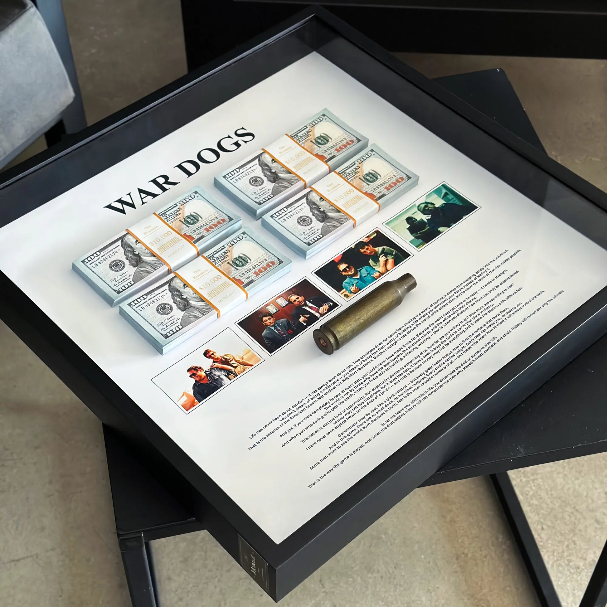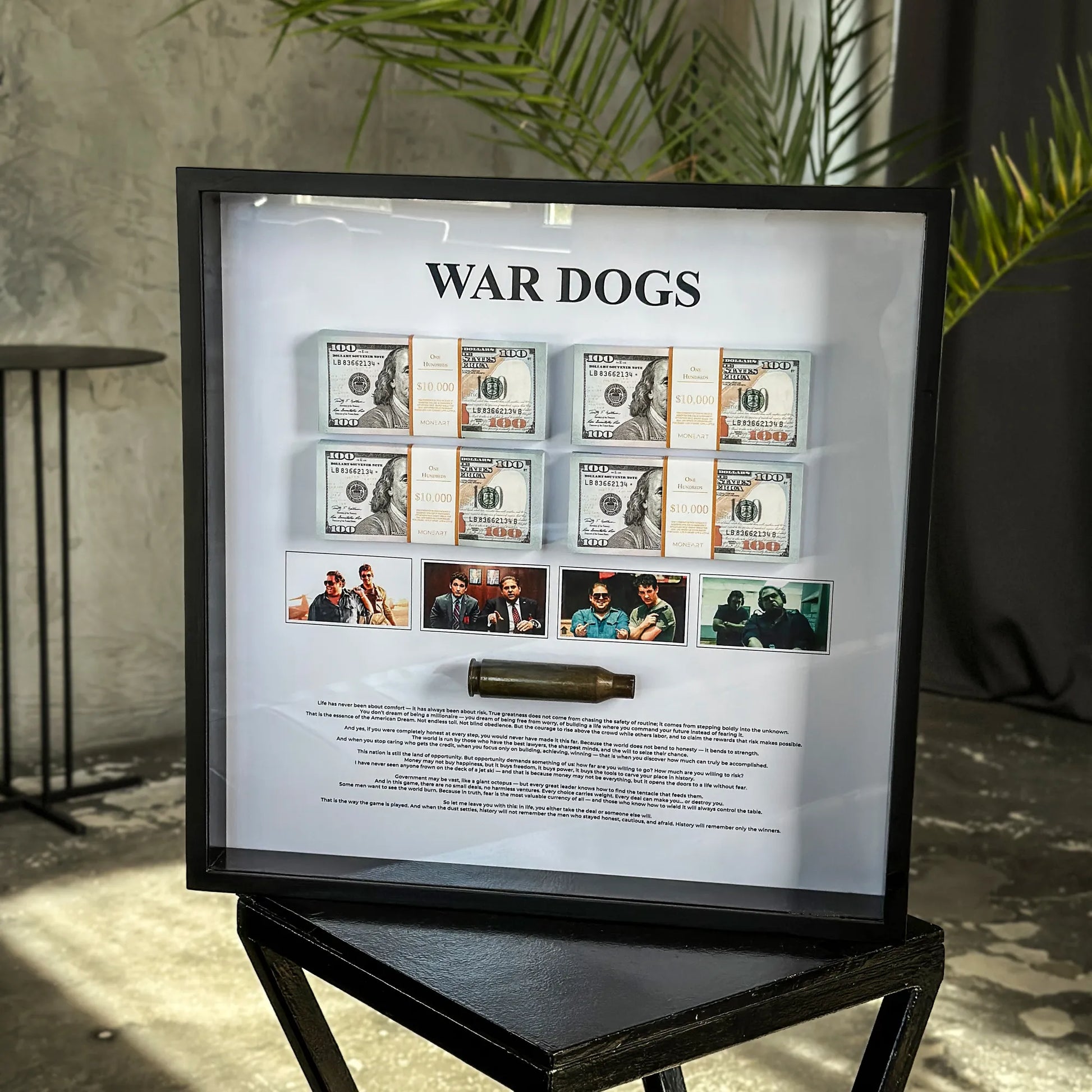Handmade War Dogs–inspired money wall art in a premium 50×50 cm wooden frame with real glass.