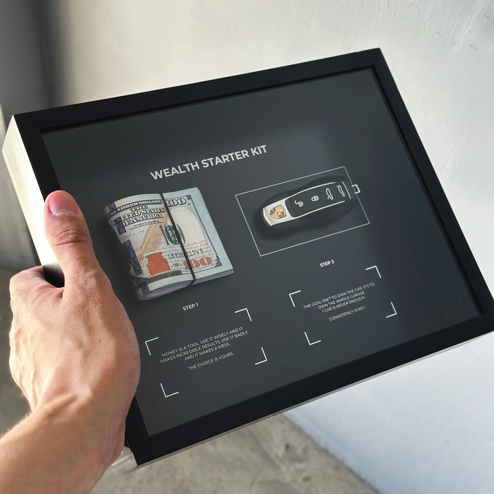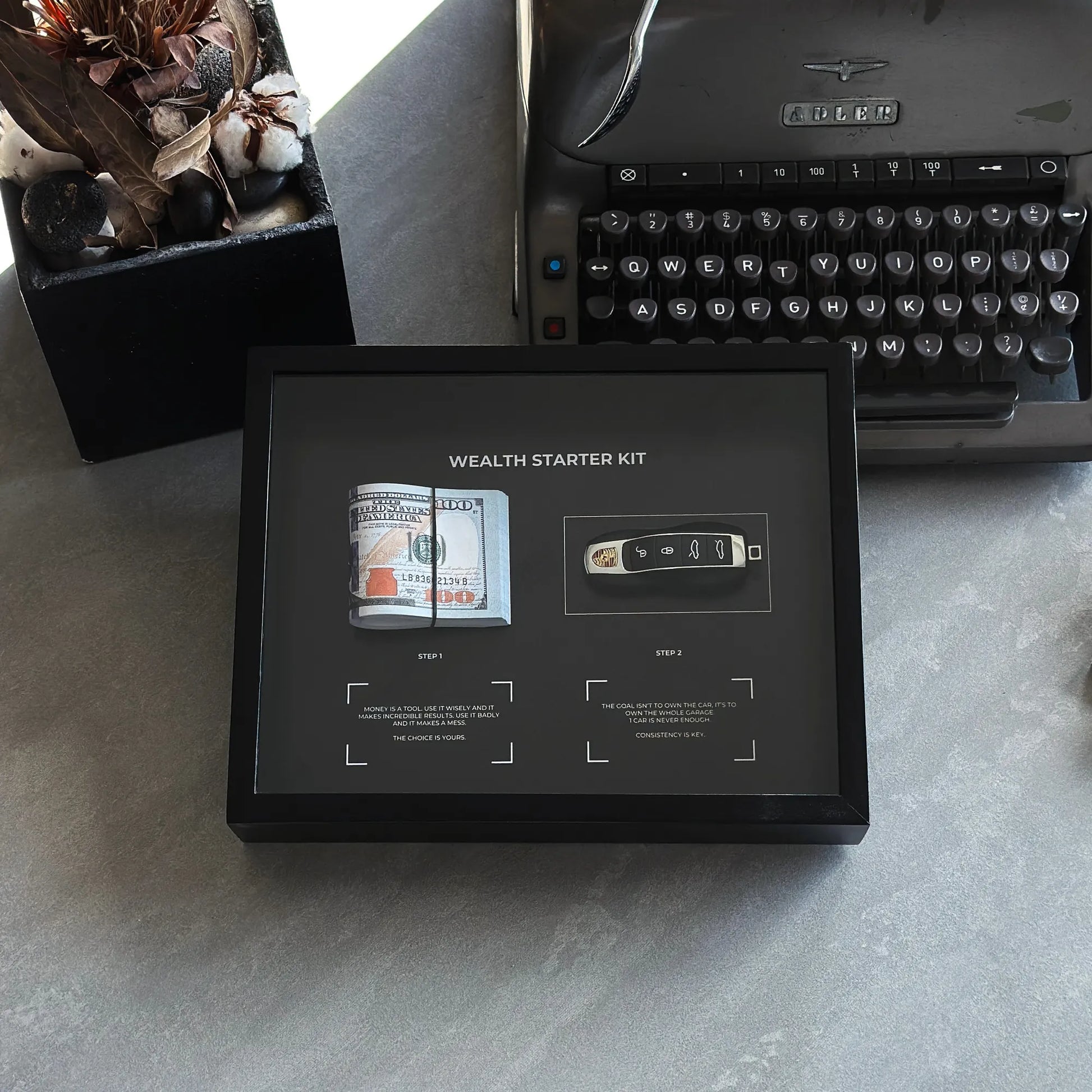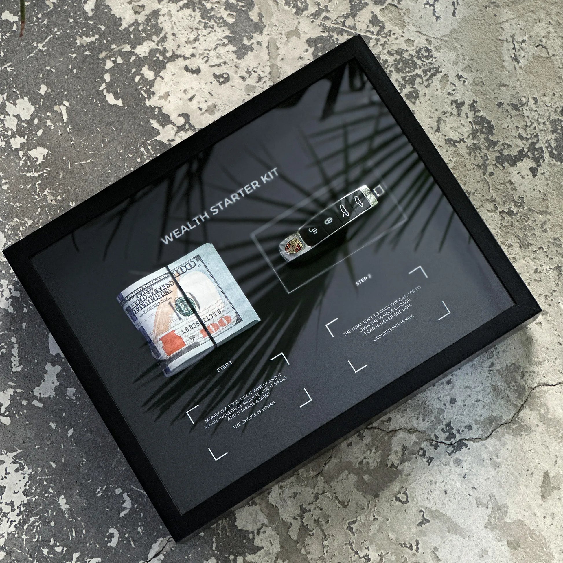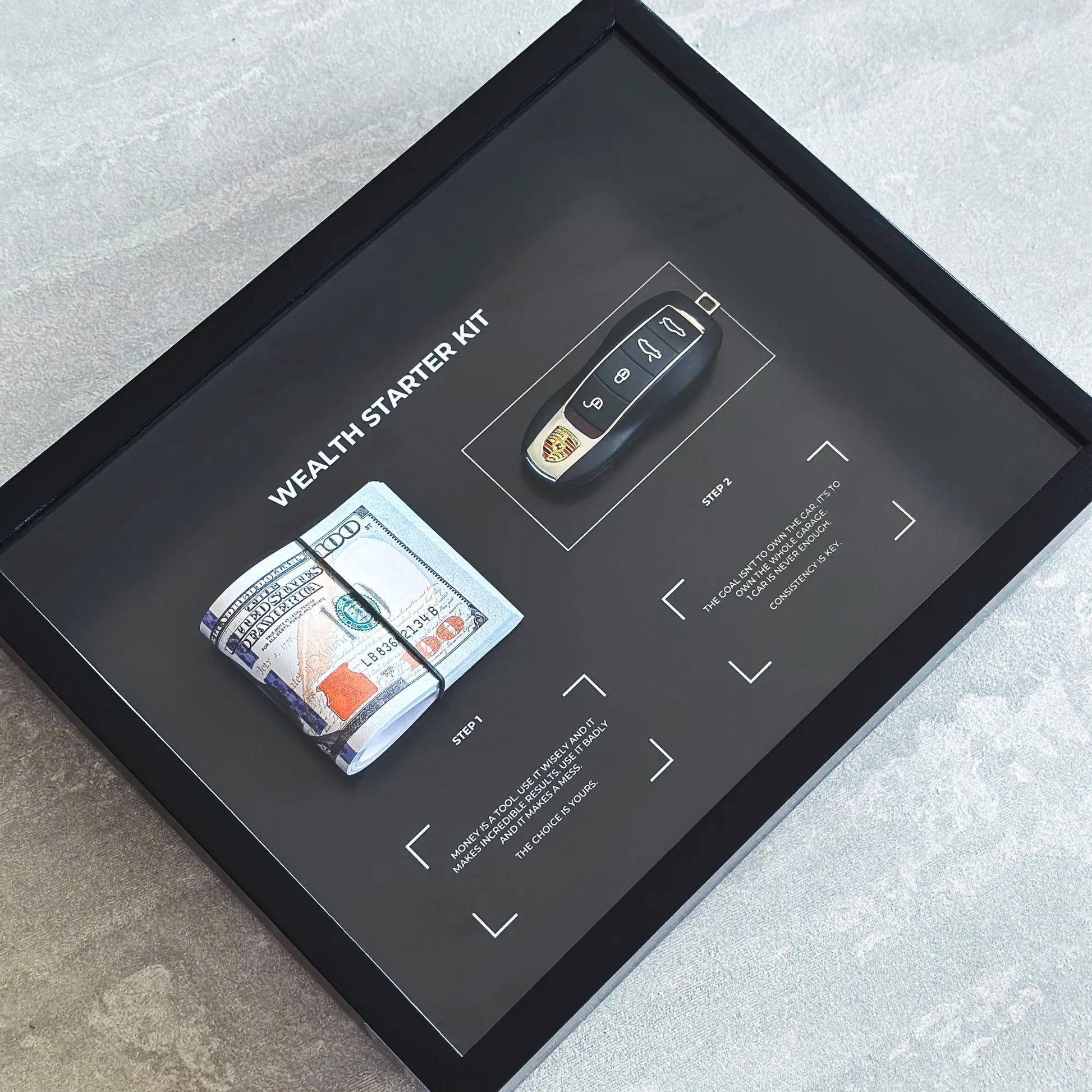 Handmade Wealth Starter Kit wall art in a premium deep wooden frame with real glass. This luxury shadow box includes a decorative money stack and a symbolic car key accent — representing the first steps toward ambition, success, and financial freedom. A perfect motivational decor piece for entrepreneurs, traders, and dreamers.