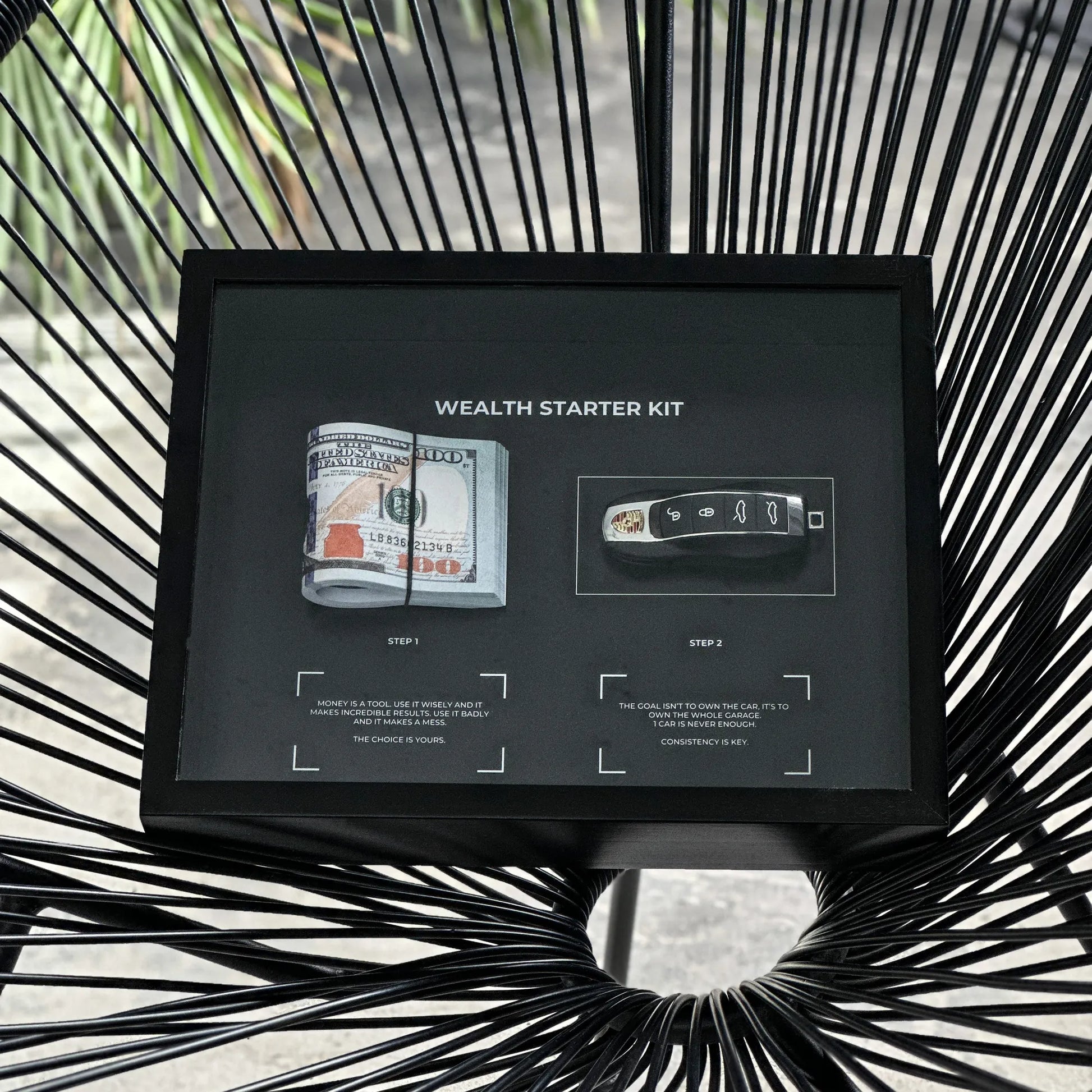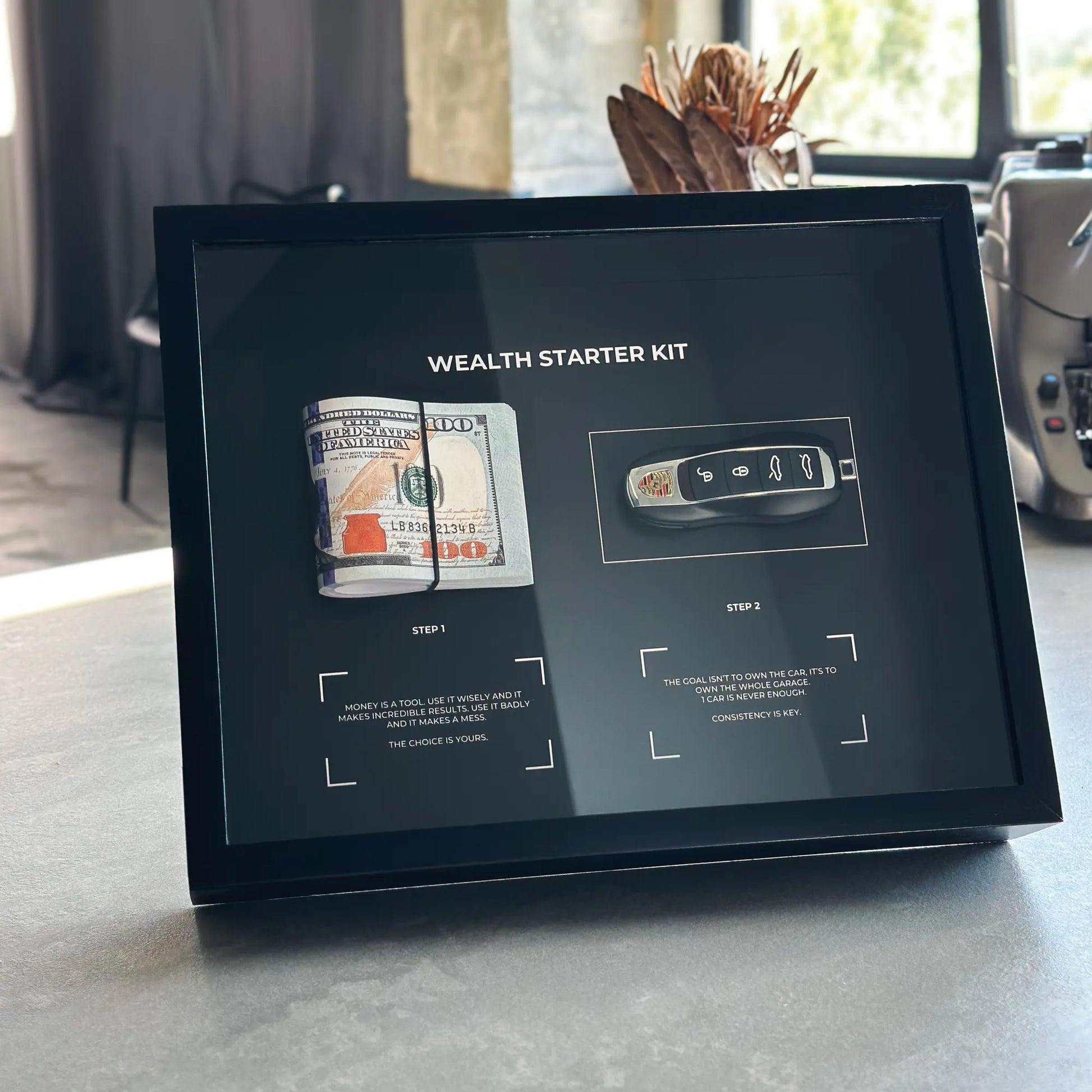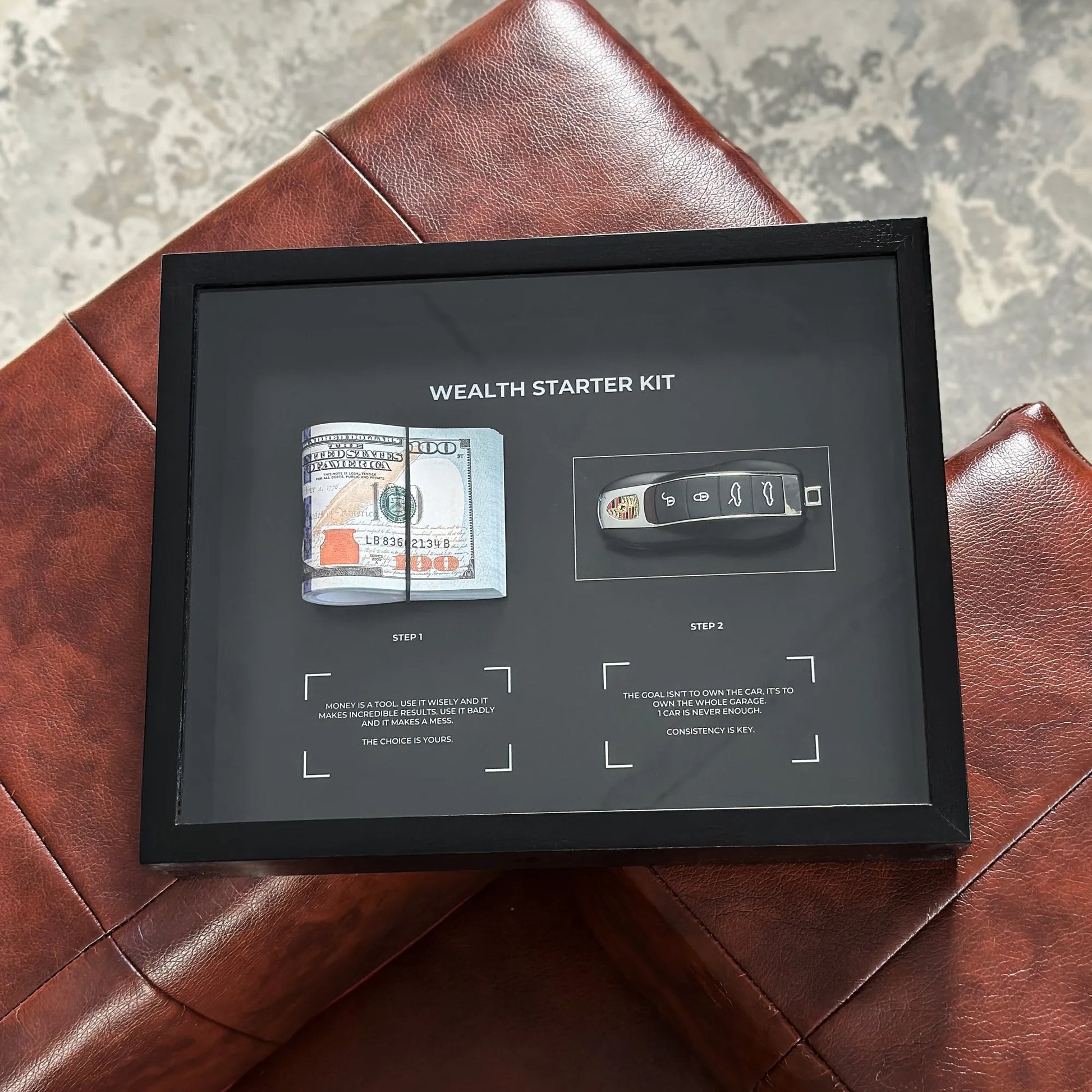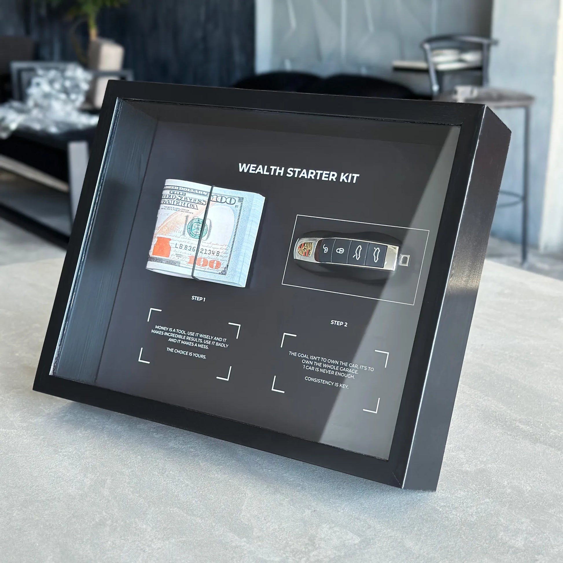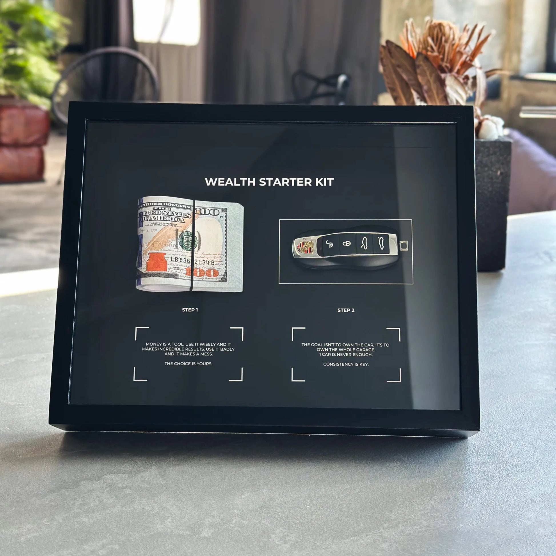 Handmade Wealth Starter Kit wall art in a premium deep wooden frame with real glass. This luxury shadow box includes a decorative money stack and a symbolic car key accent — representing the first steps toward ambition, success, and financial freedom. A perfect motivational decor piece for entrepreneurs, traders, and dreamers.